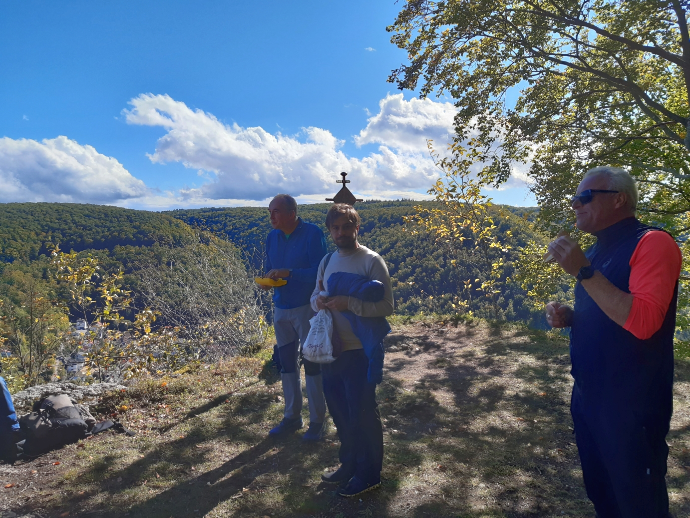 Die Anstrengung wurde mit einem tollen Ausblick über Geislingen belohnt. Weiter ging es am Albtrauf entlang zum Eybacher Wahrzeichen dem Himmelsfelsen wo wir ein wohlverdientes Vesper genossen. Anschließend führte uns der Weg hinunter nach Eybach, wo wir die nötige Pinkelpause gleich zu einem kleinen Umtrunk im Ochsen nutzten. So waren wir gut vorbereitet für den nächsten Anstieg durch das wildromantische Felsental hinauf nach Weiler.